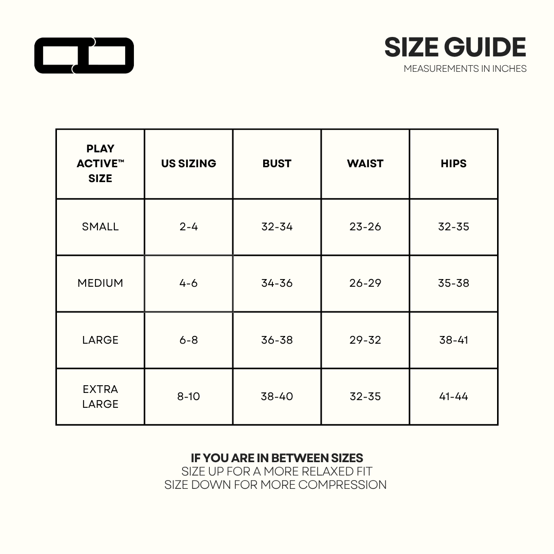 If you are in between sizes, size up for a more relaxed fit and size down for more compression.